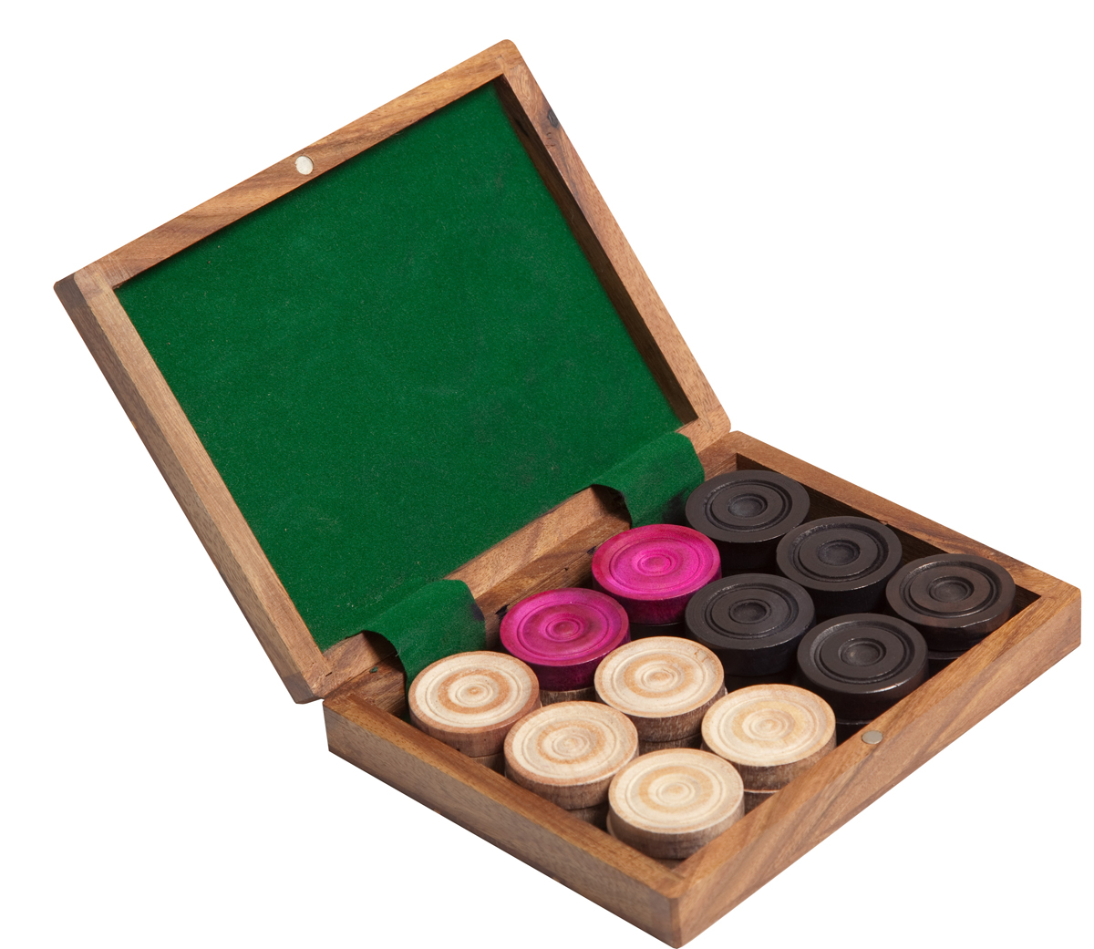 La boite de pions de Carrom "Break To Finish" comprend 11 pions Noirs , 11 pions Blancs et 2 pions Rouges dans une boite en bois
