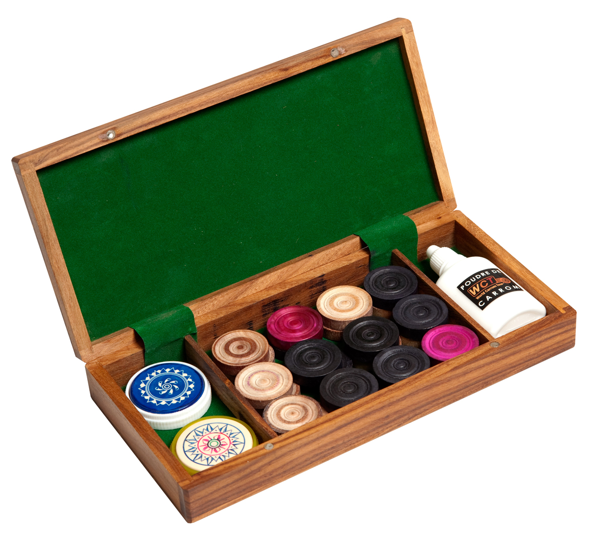 Le Coffret en bois d'acacia " World Carrom Tour " comprend :